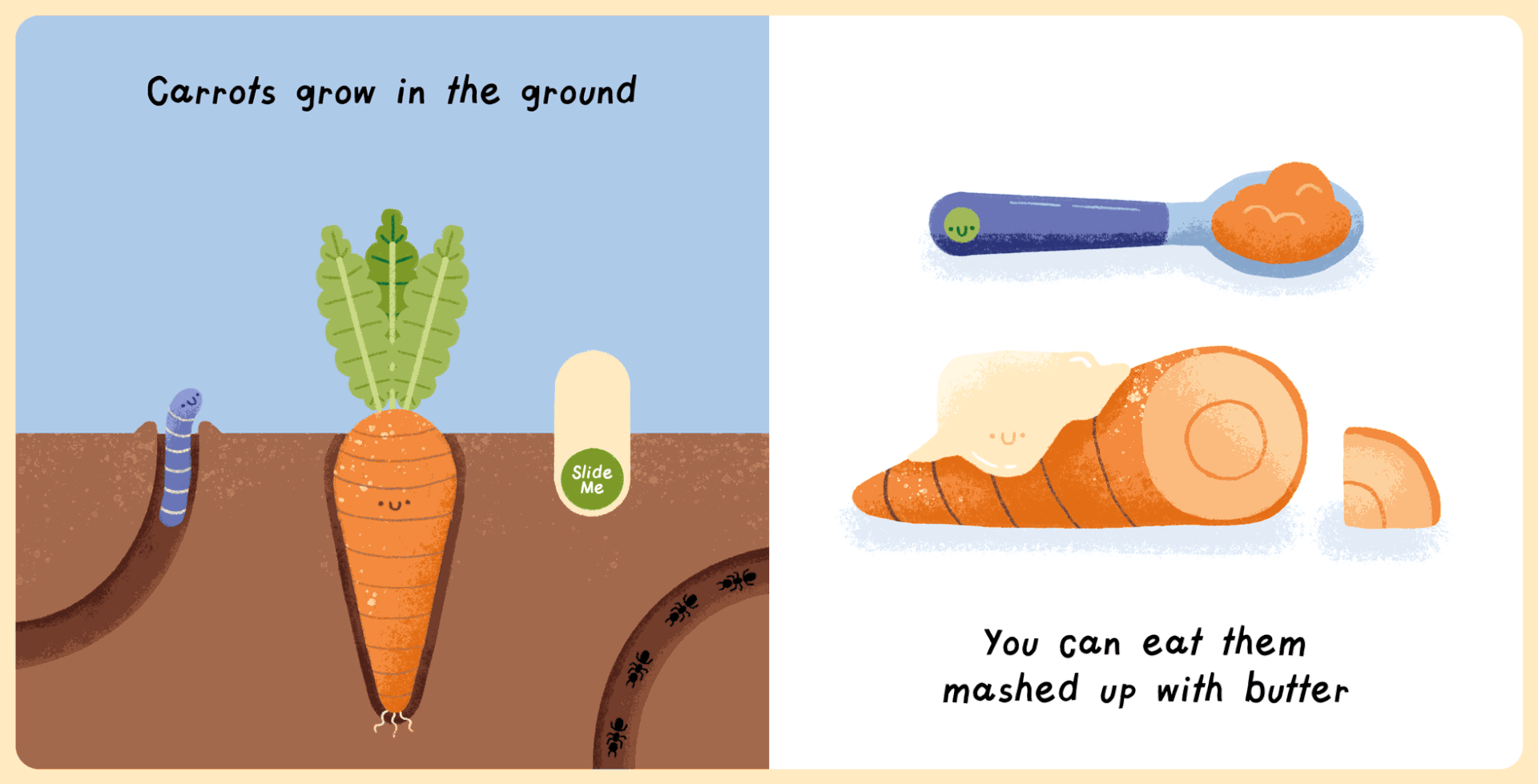 "My First Foods" is a children's board book all about the different foods your baby would try in their first year of life. It has some fun "slide me" actions for your little one to interact with.